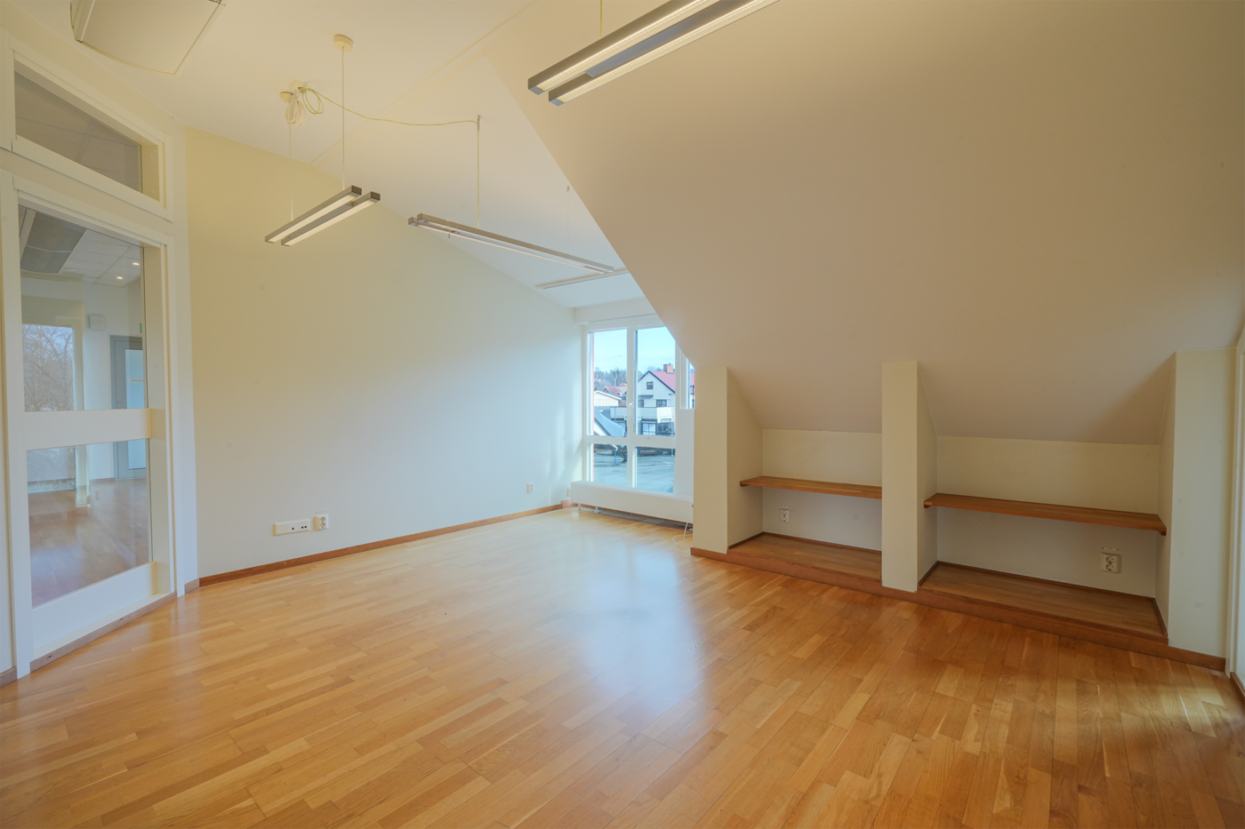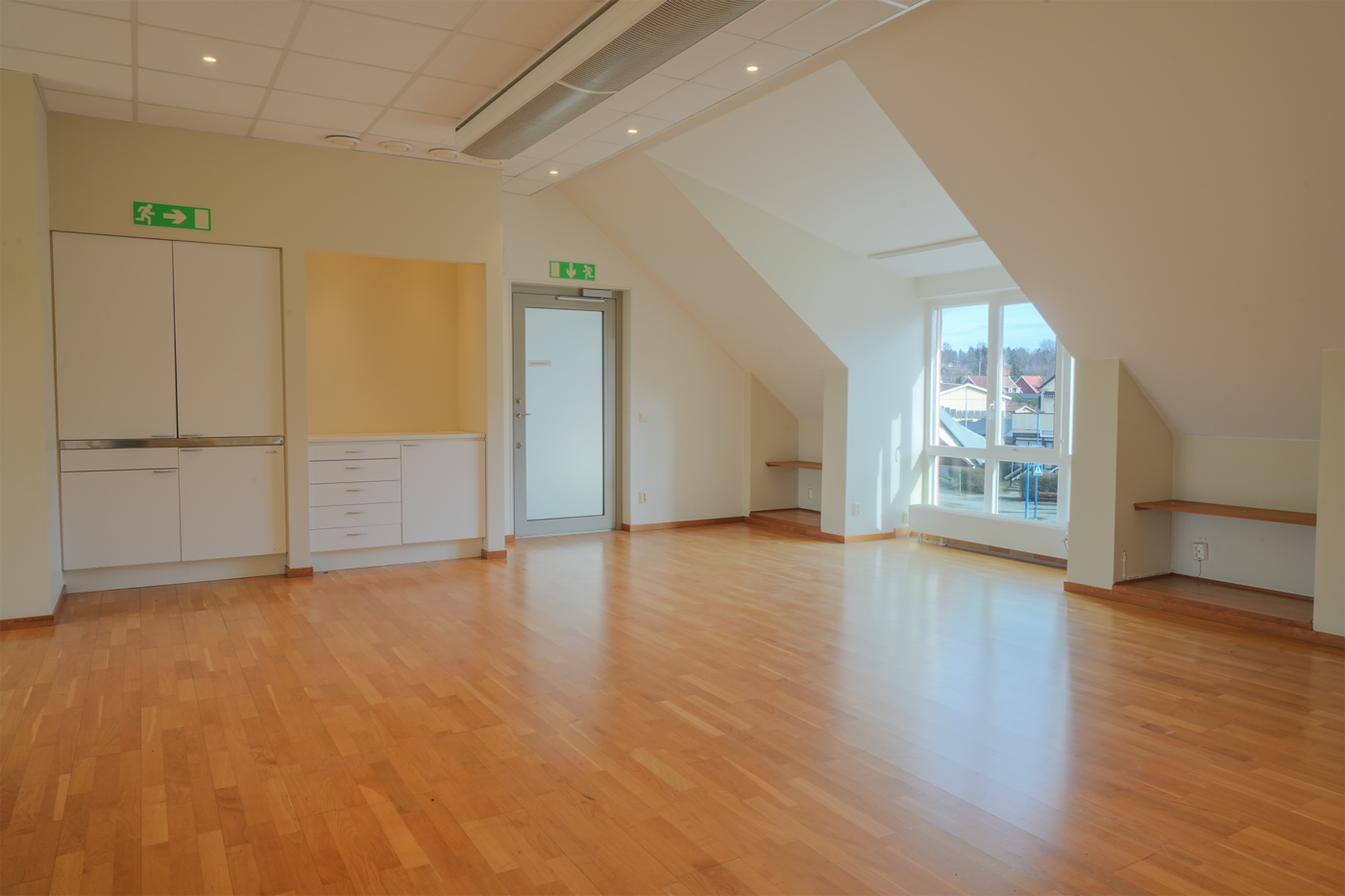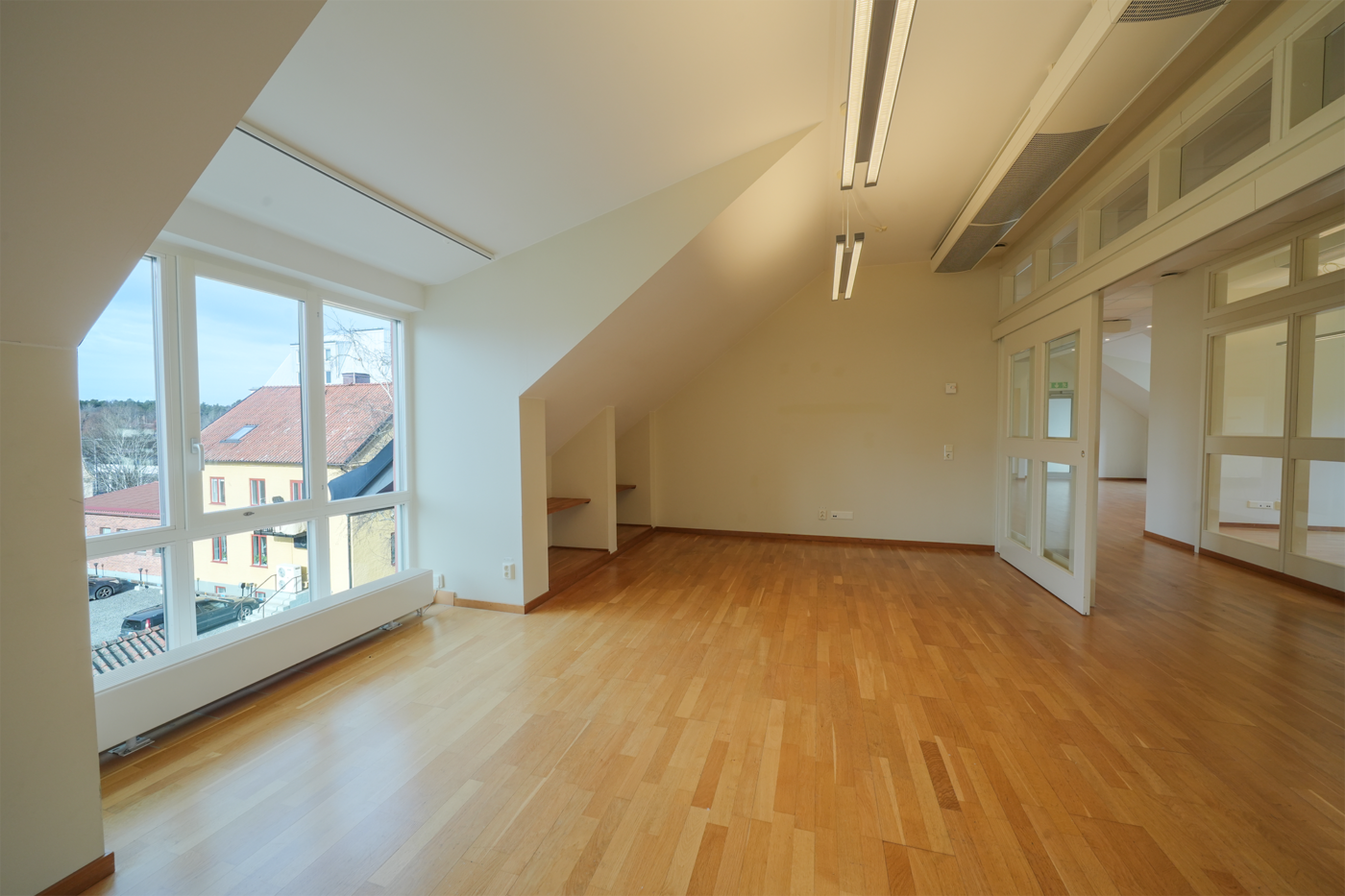 Ljus och representativ kontorslokal med centralt läge i Knivsta. Lokalen är belägen högst upp i centrumhuset vi lät bygga år 2005 och erbjuder en ljus och inbjudande arbetsmiljö. Med stora fönsterpartier från golv till tak, åt både öst och väst, tillsammans med kontorsrum som har glaspartier infinns ett behagligt och genomgående ljus. Lokalen har sluttande tak och genomgående parkettgolv i ek.